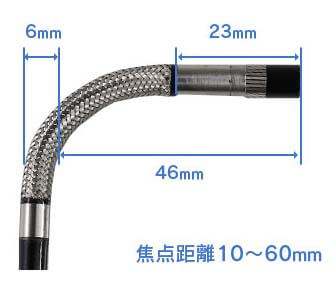 先端ケーブルを曲げた時の長さ46mmと、ケーブル径6mm、焦点距離10mmの合計62mm以上の幅があれば先端を直角に曲げて真横を見ることができます。