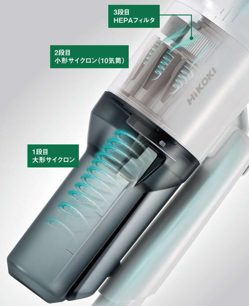 大きなゴミと空気を大形サイクロンで遠心分離後、細かいゴミを小形サイクロン(10気筒)で遠心分離します。残った微粒子は高性能(HEPA)フィルタがキャッチ。そのため、フィルタが目詰まりしにくく、強い吸引力が持続します。