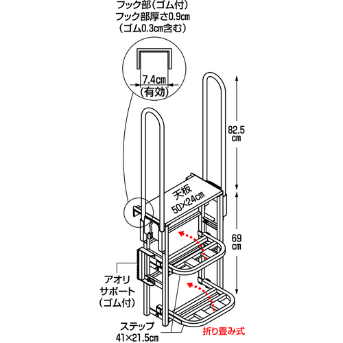 | 仕様・規格 | 組立式 フック有効幅:7.4cm 天板あり(天板寸法:50×24cm) ステップ幅:41cm 最大使用荷重:100kg 手すり付き 段数:3段 最大使用質量(kg):100 天板寸法(mm):500×240 収納寸法(mm):600×277×770 段数(段):3 全長(mm):1515 幅(mm):770 フック有効幅(mm):74 全長(m):1.515 |