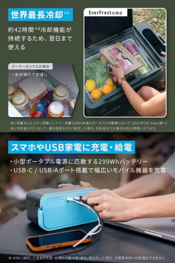 | パッケージ内容 | ・Anker EverFrost Powered Cooler 30 ・Anker Detachable Battery For Powered Cooler ・収納バスケット ・AC充電ケーブル ・XT-60ケーブル ・シガーソケット充電ケーブル ・取扱説明書 ・長期保証(18ヶ月保証に加え、Anker会員登録後に製品本体 (コンプレッサー除く) 及びバッテリーは+6ヶ月、コンプレッサーは+18ヶ月の延長保証が付きます。) ・カスタマーサポート |