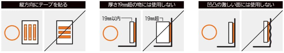 特に注意することは…縦方向にテープを貼る!!厚さ19㎜超の物には使用しない!!凹凸の激しい面には使用しない!!です。