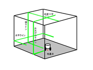 レーザー墨出し器は、レーザー光を壁面や床面・天井に照射して「水平」や「直角」などの施工の基準線(ライン)を出す機械です。基準となる線を出す作業を建築用語で「墨を出す」と言い、レーザーで墨線(基準線)を出すので「レーザー墨出し器」と言います。何かを、「作る・建てる・取付ける・貼る・重ねる」など、様々な作業をする際に、基準になる「点・線・水平・角度・鉛直・立ち」などの確認にレーザー墨出し器が必要になります。主に建設現場での大工工事・基礎工事に使われ、製造工場からイベント会場まで幅広い業界・様々な用途で使われています。