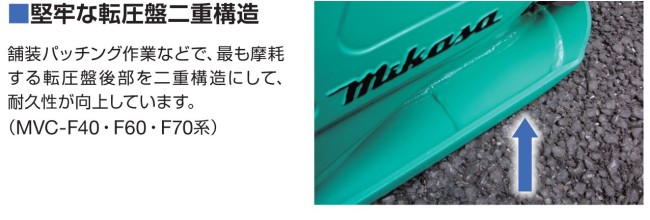 舗装パッチングの作業で一番摩耗する転圧盤の後ろ側を2重構造にして耐久性を上げている機種もあります。(MVC-F40・F60・F70系)