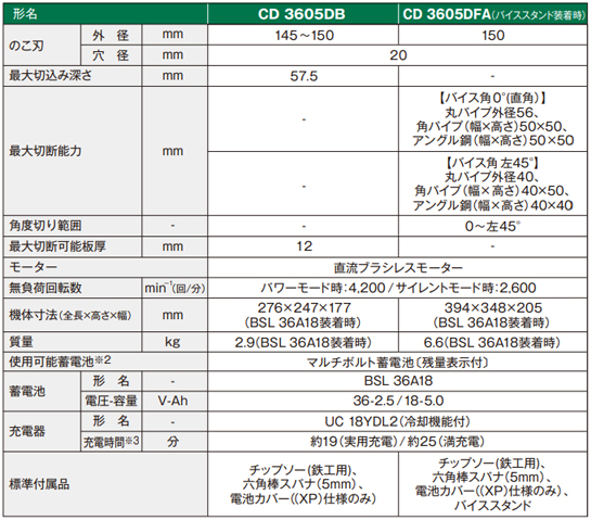 | 標準付属品 | チップソー(鉄鋼用)、六角棒スパナ(5mm)、電池カバー((XP)仕様のみ) |