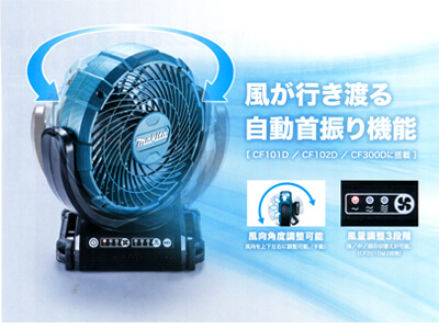 マキタから新しく発売されましたCF102DZをご紹介したいと思います。リチウムイオンバッテリーで涼しく快適にすごせます。新しく登場したCF102DZは風が行き渡る”自動首振り機能”を搭載しています。CF102DZは羽根径が180mmです。そのほかにも大きなサイズのタイプで種類がございます!CF201DZ青/W白は羽根径が230mm、CF300DZは羽根径が330mmです。快適な涼風を手に入れられるファンシリーズを詳しく解説していきたいと思います。