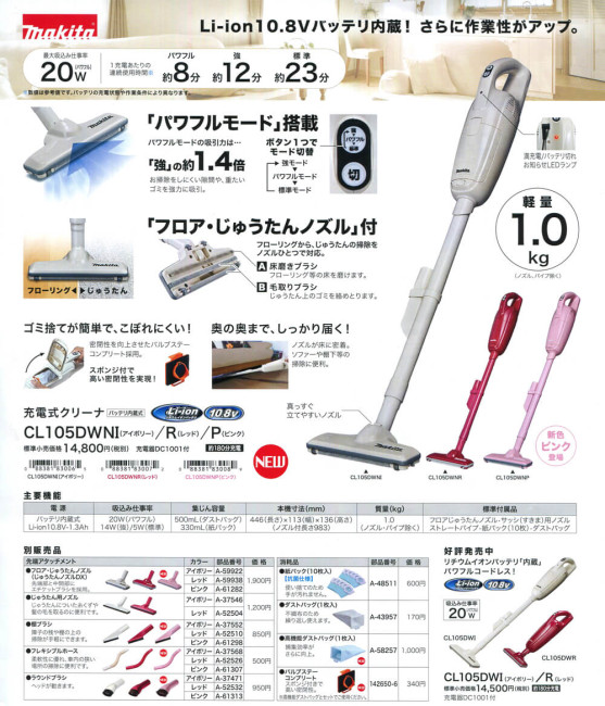 マキタから10.8V小型・軽量クリーナーCL105DWNが発売されました!今回は新色ピンクが加わり、全部で3色になりました!アイボリーはCL105DWNI レッドはCL105DWNR ピンクCL105DWNP 今回のマキタ新型クリーナーは、フロア・じゅうたんノズルを標準装備してパワフルモードがワンタッチで行えるようになっております。新色ピンクが出たのも注目のポイントです。集塵方式は紙パック式です!それでは詳しく解説していきます。