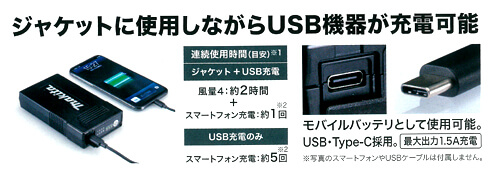 USB・Type-Cを採用しているので、モバイルバッテリとしても使用可能。目安として、風量4でスマートフォンを充電した場合、ジャケットを約2時間、スマートフォンを約1回充電できます。またUSB充電のみなら、スマートフォン約5回充電できます。※1、※2