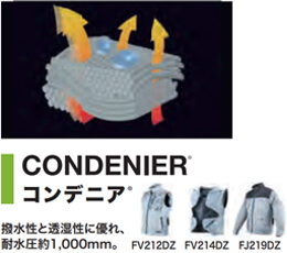 FV214DZはCONDENIER(コンデニア)という生地を採用しました。アウトドアやスポーツ製品にも採用されている生地です。撥水性や透湿性に優れています。 耐水圧は約1,000mm。