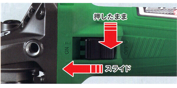 押したままスライドさせないと起動しないようになっているので、不意なスイッチONを防ぎ、万一の場合にもOFFにしやすくなりました。