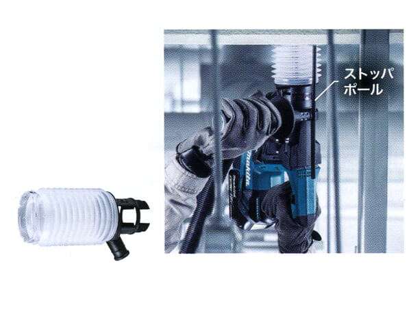 集じん機に接続も可能な集じんカップとメモリ付ストッパポールを標準付属しております。クリーンな作業が可能となります。