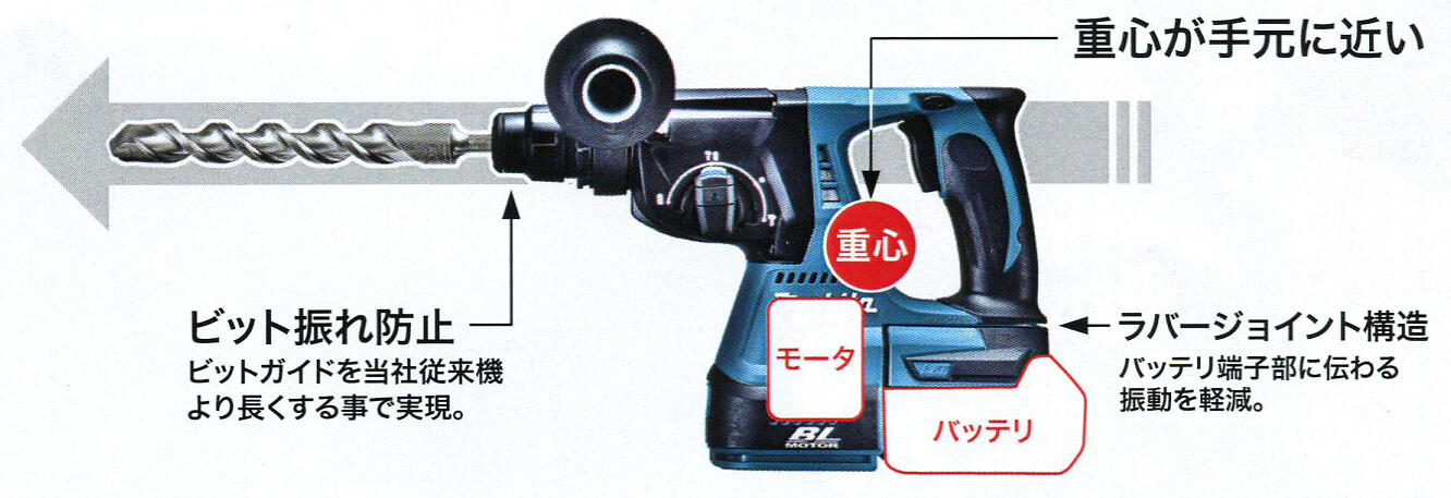 | 回転数(min⁻¹)[回転/分]:0〜950 打撃数(min⁻¹)[回/分]:0〜4,700 機体寸法(長さ×幅×高さmm):328×85×213 質量(kg):3.0(バッテリ含む) 標準付属品:サイドグリップ・ストッパポール 振動3軸合成値(m/s²):13.5(ハンマドリル)10.5(ハンマ)3.5(ドリル) 約45分充電 セット内容:バッテリBL1860B×2本、充電器DC18RC、ケース付※ビット別売 |