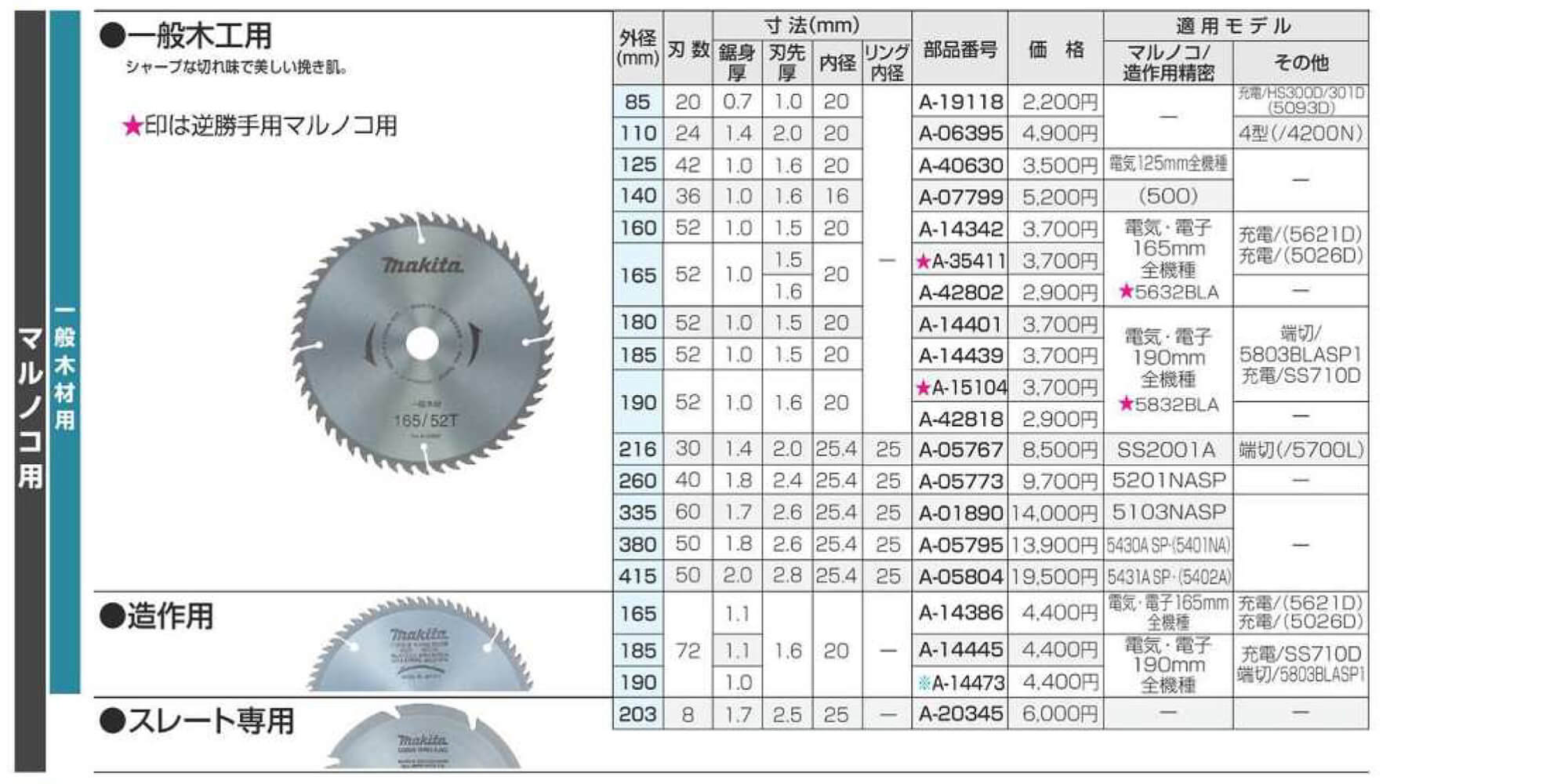マキタ 一般木工用チップソー A-19118/A-06395/A-40630/A-07799/A-14342/A-35411/A-42802/A-14401/A-14401/A-14439