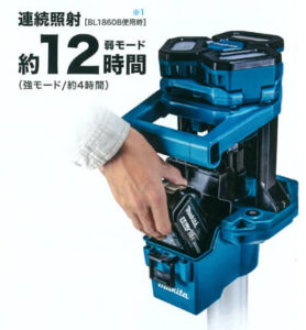 本機はリチウムイオンバッテリ18V、14.4Vに対応しています!連続照射実感は弱モードで約12時間!強モードでも約4時間使用可能です!