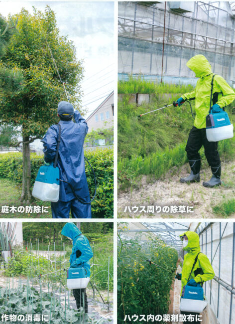 使用例)庭木の防除、ハウス周りの除草、作物の消毒、ハウス内の薬剤散布 など