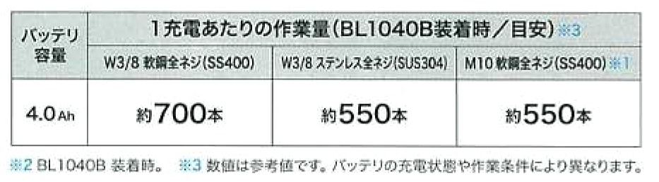 <1充電当たりの作業量>(BL1040B装着時/目安)