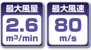 UB182DZの最大風量は2.6m³/min。最大風速80m/s。