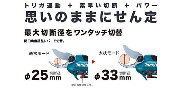 思いのままにせん定ができ、最大切断径をワンタッチ切替でらくらく操作!!