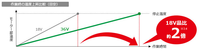 リチウムイオン電池を18Vから36Vに高電圧したことでネジ締めスピードが約10%アップしました。電池容量が減少したことでネジ締めスピードが落ちにくくなっています。太いネジでも締付作業が行え、連続作業時に18V製品より止まりにくく連続作業に強くなりました。