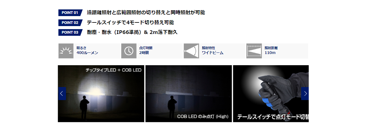 | 点灯時間(約) | 2時間(全ライト点灯時)4時間(チップタイプLED点灯)/10時間(COB LED Ecoモード時)/6時間(COB LED Highモード時) |