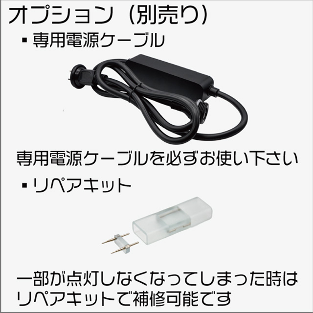 | 片面(10m) | 15mm×8mm | 120個/m | 75W | 二重絶縁構造 50/60Hz兼用 |