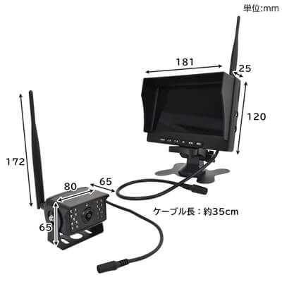 | 付属品 | ・モニター ・カメラ ・アンテナ2本 ・モニター日よけ ・モニター台金具 ・モニター台 ・固定シール ・シガーケーブル(140cm) ・電源ケーブル(90cm)2本 ・プラスドライバー ・モニター固定ネジ ・ネジ大6本 ・ネジ小4本 ・日本語取扱説明書 |