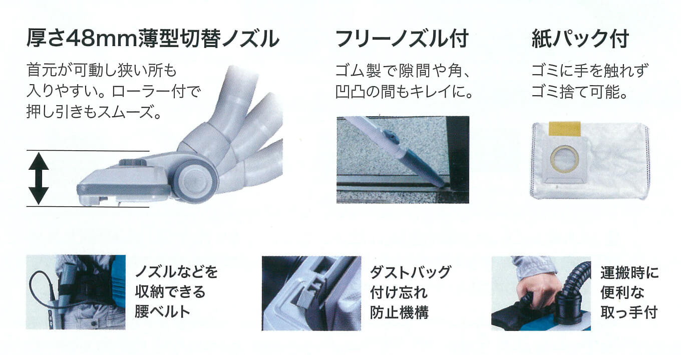 | 標準付属品 | ホース(内径32mmx1.0m)、ロック付ベンディングパイプ、ロック付伸縮パイプ、薄型切替ノズル、フリーノズル、ホースバンド(本機取付)、紙パック(10枚+本機取付1枚)、HEPAフィルタ |