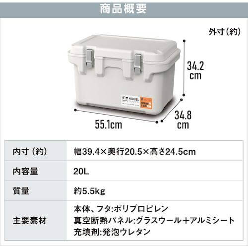 | 主要素材 | 本体・フタ:ポリプロプレン 真空断熱パネル:グラスウール+アルミシート 充填剤:発泡ウレタン |